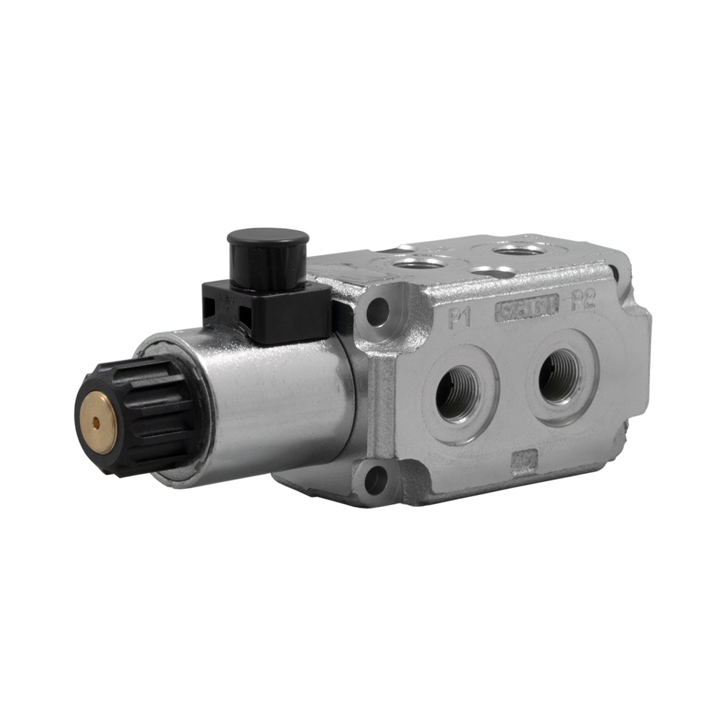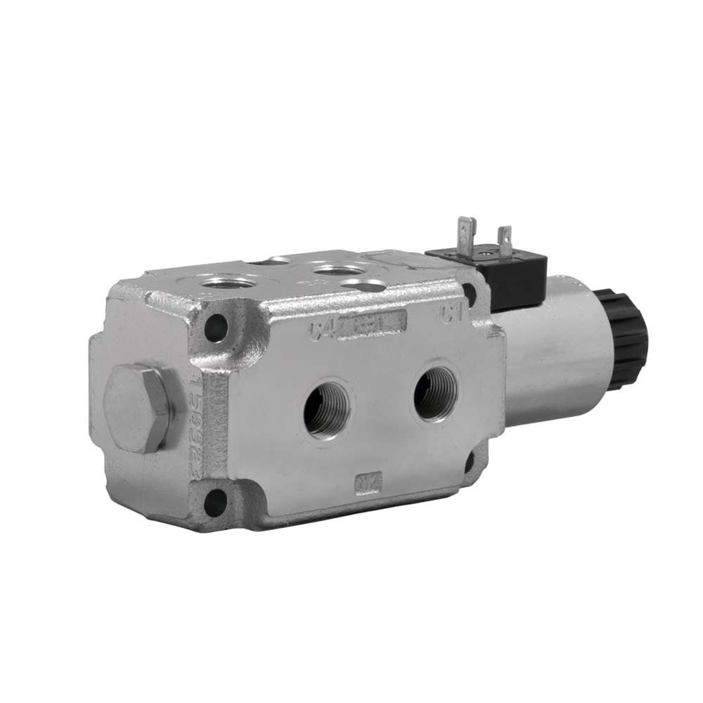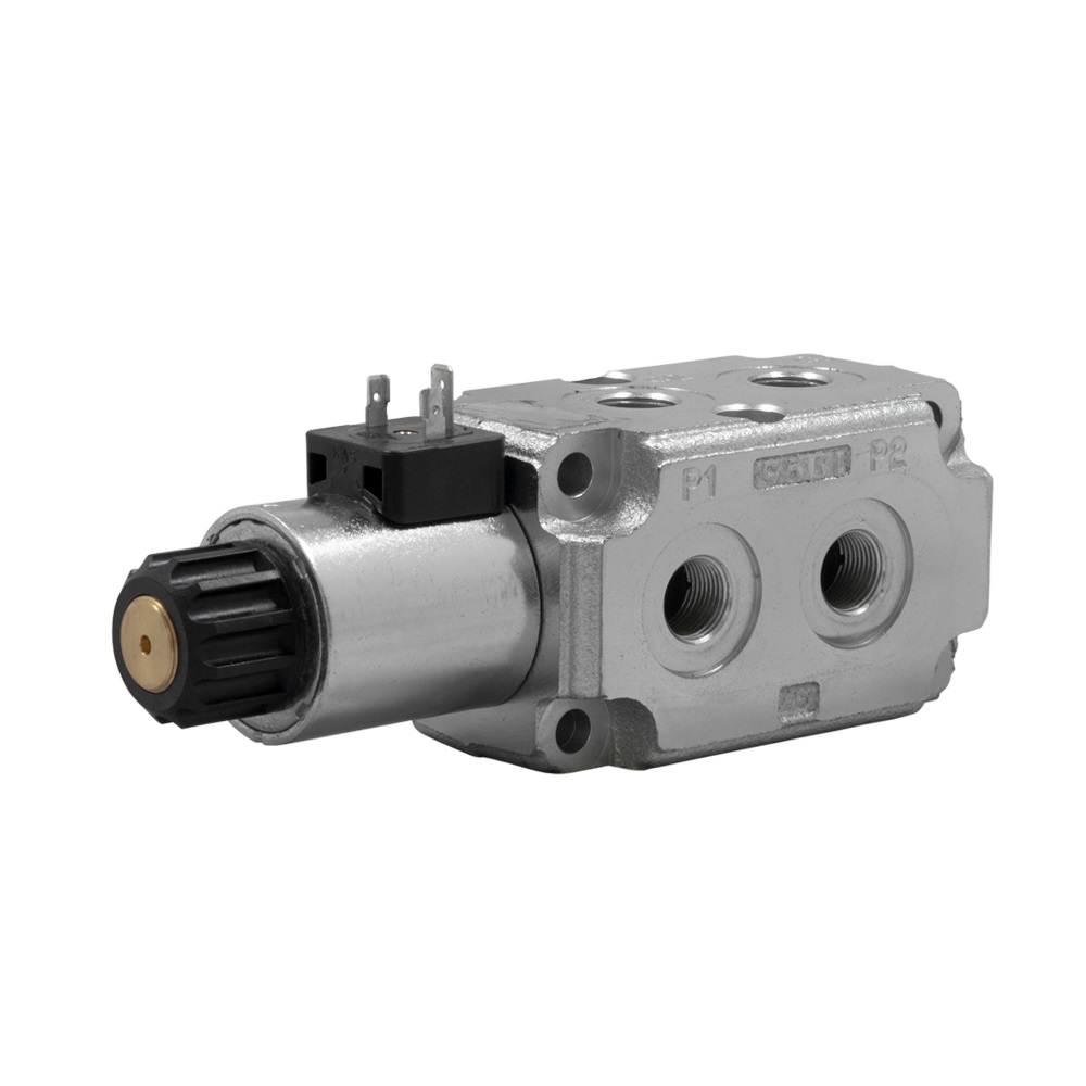 Das elektrisch betätigte 6/2 Wege Umschaltventil ist geeignet um doppelwirkende Funktionen mit einem max. Volumenstrom von 50l/min sowie einem max. Druck von 250bar miteinander zu verschalten.
